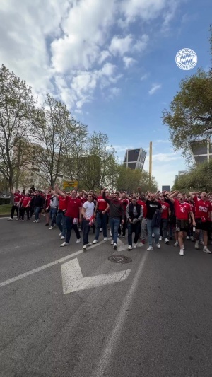 声势浩大!赛前拜仁球迷远征军高喊口号,朝伯纳乌进发