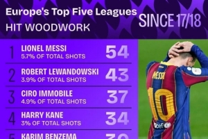 值得一提的是,梅西的5.7%中柱次数百分比也高居第一。