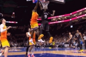 GIF-新秀詹姆斯隔扣奥萨尔被犯规 活塞挑战成功