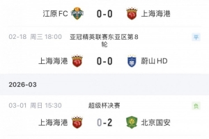 在2月中旬进行的亚冠精英联赛东亚区最后两轮赛事中,海港分别0-0战平江原FC和蔚山HD。上周的超级杯,海港0-2不敌国安。
